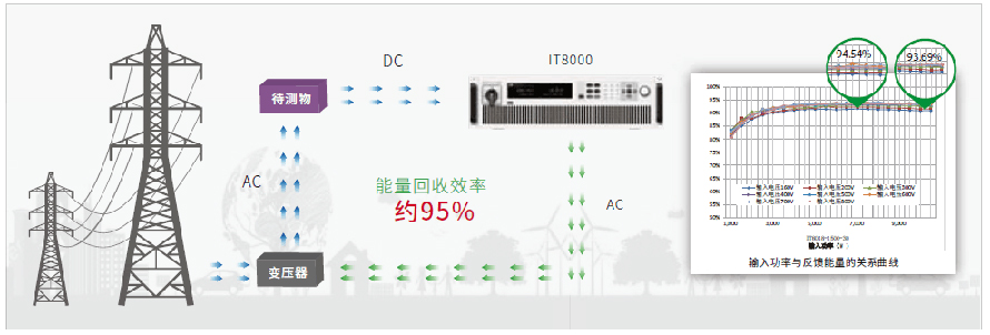 IT8000系列能量回饋式直流電子負(fù)載不同于能量消耗型的普通電子負(fù)載,其主要的特點是提供能量回收功能,可以回收電能然后廠內(nèi)直接利用,而非以熱能的形式消耗掉。其轉(zhuǎn)換效率可約95%,不但大大降低了用戶的用電成本,同時也避免使用空調(diào)或昂貴的制冷系統(tǒng),減少噪音。