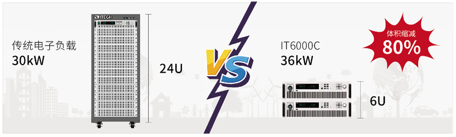 普通的能耗性電子負(fù)載不僅耗能耗電,本身的體積和重量也大。30kW的能耗型負(fù)載體積至少要24U,不但搬運困難,成本較高。IT8000系列能量式直流電子負(fù)載采用高功率密度設(shè)計,3U體積內(nèi)可提供18kW的功率吸收。同樣的輸出功率,體積減少了80。