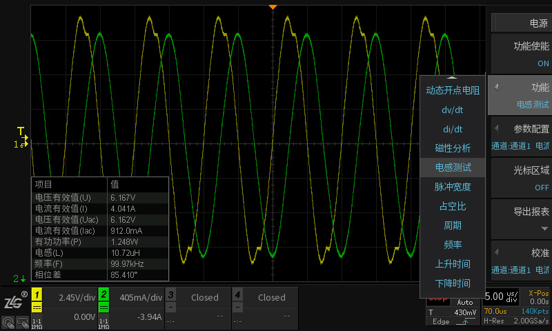 開關電源的質量直接影響到產品的技術性能以及其安全性和可靠性。電源測試項目多,計算量大,統計繁瑣等問題一直困擾著工程師們,為了解決這些問題,致遠電子在示波器中增加開關損耗、SOA、電感測試等電源分析功能。如在電感測試功能中可直接對電感、有功功率等項目進行計算,方便工程師快速、準確地測試電源產品。