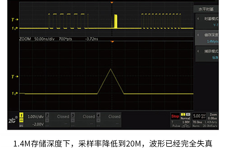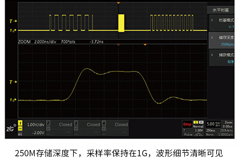 如果存儲深度能夠做到足夠大,就能保持較高的波形采樣率,則觀察到的波形會真實、細膩。反之,如果存儲深度只有1Mpts甚至低,當要觀察時長較大的波形時,示波器就只能被迫降低采樣率。由于采樣點數不足,示波器顯示的波形也會嚴重失真,甚至產生波形混疊,誤導用戶測量分析。ZDS3000/2000B系列示波器創新性地采用DDR3存儲技術,配合大規模的FPGA器件,通過全硬件加速和多線程并行處理,存儲深度高可達250M !在觀察長時間波形時也不丟失波形細節。
