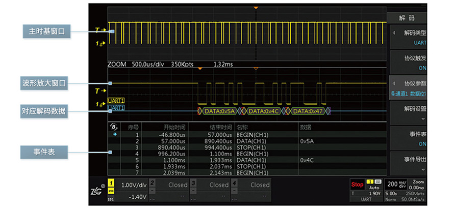 在調試協議信號的時候,不僅需要觀測協議波形,還要將波形解碼成對應的數據。但一直以來各大品牌示波器的協議解碼功能都要付費選配的,而且只有寥寥幾種。ZDS3000/2000B系列示波器基于客戶需求免費配備了41/29種協議解碼,CAN、LIN、IIC、SPI、UART、USB、PS/2、DALI、Wiegand、1-Wire、DS18B20、HDQ、 SD_SPI、SD_SD、IrDA、Manchester、DiffManche、Miller、DHT11、 SHT11、 NEC、RC5、RC6、FlexRay等,除此之外,ZDS3000/2000B系列示波器還免費配備了CAN FD協議解碼,再一次定義了200M示波器!