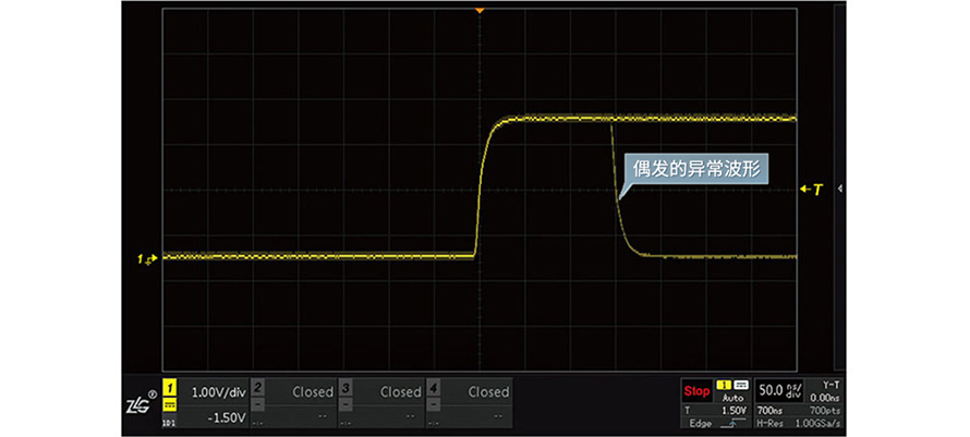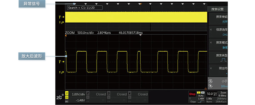 在調試信號波形時,我們需要明確信號是否出現了異常。如果出現了異常,那這些異常信號出現的頻率是多少,是不是周期性出現的呢?為了弄清楚這些問題,一般需要長時間記錄波形,然后基于這樣一個龐大的波形數據庫去定位異常波形出現的位置。ZDS3000/2000B系列示波器依托于海量存儲和硬件加速的優勢,能夠從數十萬個波形中迅速定位出感興趣的信號,只要當前屏幕內出現了符合搜索條件的波形信號,系統都將自動地在對應位置做上標記,異常信號一覽無余。