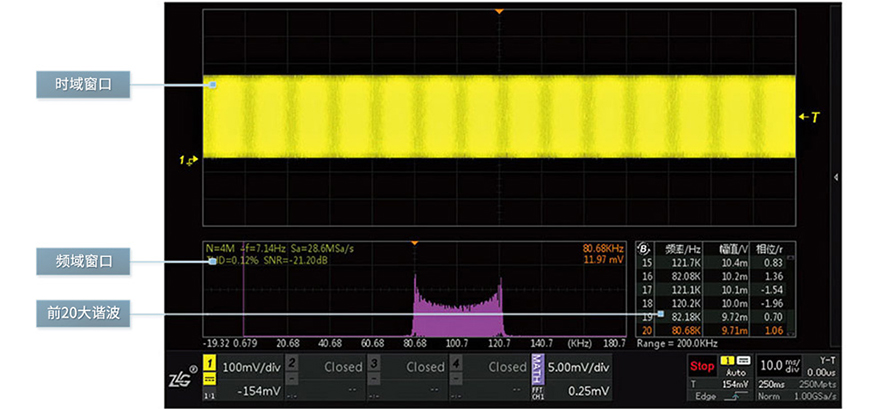市面上多數2000系列示波器MAX只支持8K樣本點的FFT分析,在1G采樣率的情況下,頻率分辨率有125KHz,多數情況都無法準確判斷信號頻譜分布。ZDS3000/2000B系列示波器拒絕單純的功能堆砌,內部采用了專業的處理芯片,將FFT分析點數升級至4M樣本點,同樣在1G采樣率的情況下頻率分辨率能準確到250Hz,可以準確分析出電路中的干擾噪聲來源,大大提高了示波器FFT的實用價值。4Mpts FFT分析功能,不僅僅是在量上突破,而且還是在質上的飛躍。