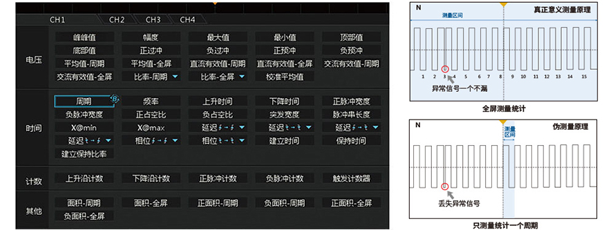 僅僅通過波形的直觀表現來分析波形遠遠不夠,只有將波形各項指標量化,才能看透波形異常的本質。然而受限于架構和芯片限制,絕大多數示波器的參數測量都是基于采樣結果進行抽點,無論屏幕中有多少個信號周期,都僅僅抽取每屏中的一個周期信號進行統計測量,這也直接導致了結果的嚴重失真。為了實現意義的參數測量統計,我們采用FPGA進行全硬件加速,通過對屏幕上每一個周期信號的測量,計算出每一項指標的MAX值,MIN值,平均值,標準差,實現了意義參數測量功能,并且多達50余種。
