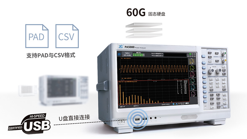 PA5000H功率分析儀擁有高達60G的固態硬盤可以海量存儲數據,用戶可以直接連接U盤將想要的數據全部儲存,PAD與CSV格式多樣支持、存儲時間隨意控制,讓存儲再也不是難題。